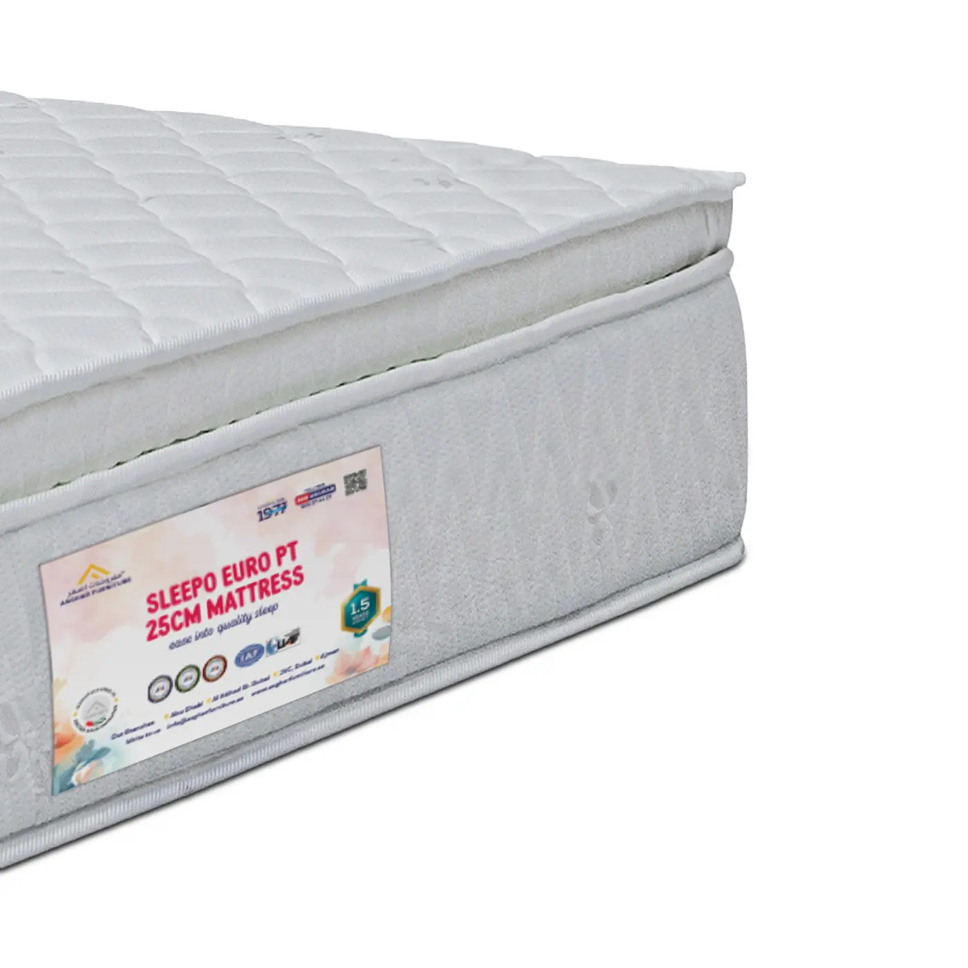 The Sleepo Euro PT 25CM Mattress blends classic support with modern comfort. Built with a durable Bonnell spring system, it offers reliable support and helps maintain healthy spinal alignment. The plush Euro pillow top adds an extra layer of cushioning, delivering enhanced comfort without sacrificing firmness. Wrapped in soft, breathable knitted fabric, this mattress creates an inviting sleep surface that promotes restful, undisturbed sleep. Backed by a 1.5-year warranty.