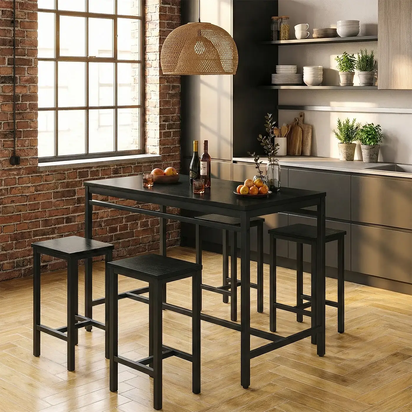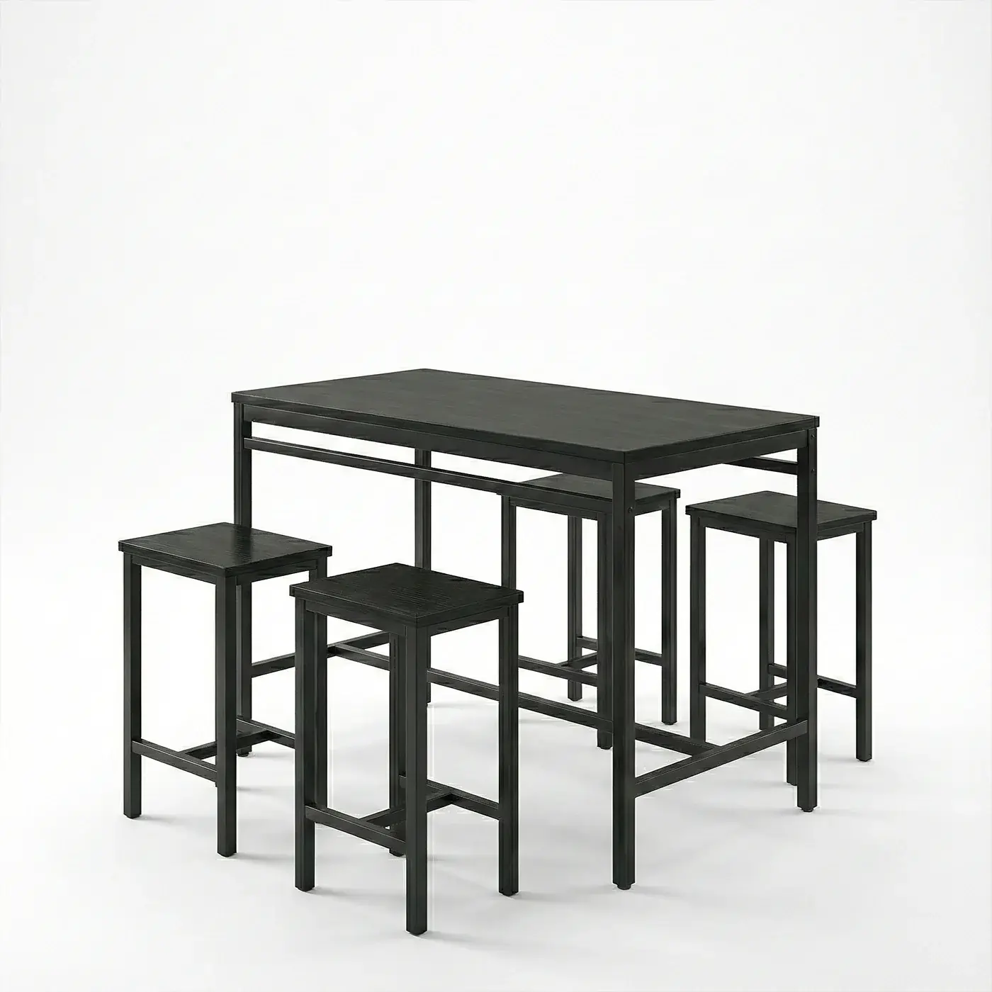 The ShadowFrame Dining Set brings modern minimalism to compact spaces with its sleek black metal frame and durable tabletop. This 4-seater set features space-saving stools that slide neatly under the table, offering sturdy construction, easy maintenance, and a clutter-free dining experience. Perfect for apartments and contemporary kitchens.