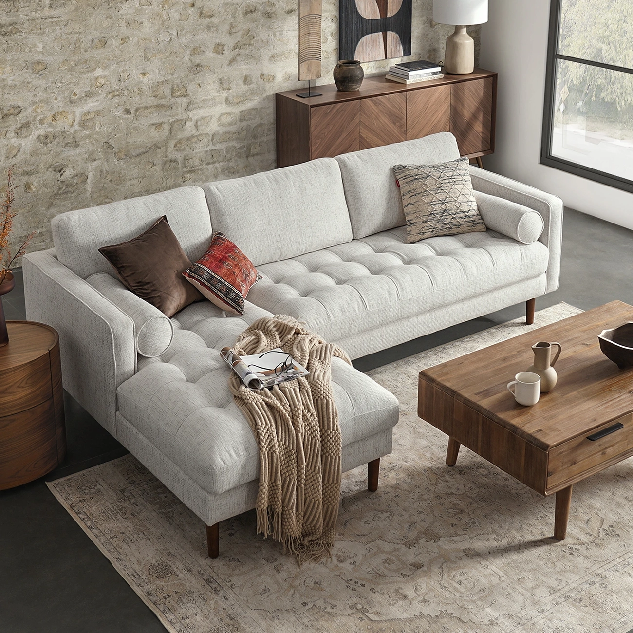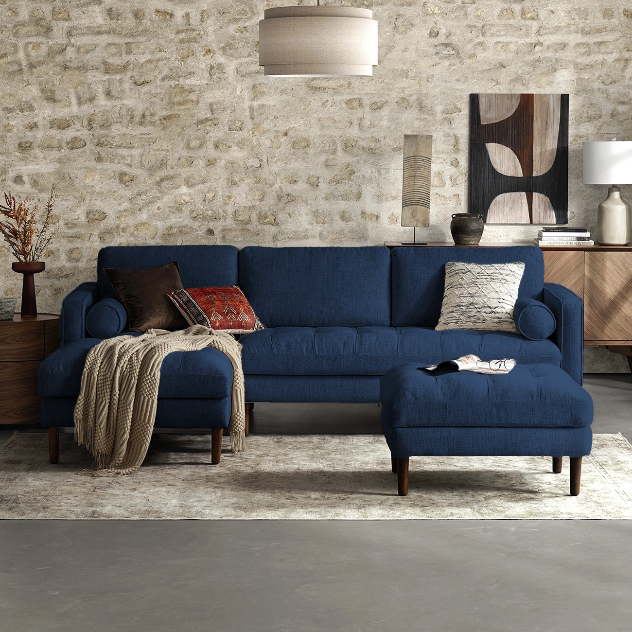 The Monroe Lounge Sectional is a Living Room Furniture luxury that unfolds in the form of textured fabric, elegant design, a comfy divan with black cushioning, and accent pillows.. It is a soft Sectional Sofa, with clean lines, a fainting couch with a vintage Ottoman touch. It comes with immense versatility, useful for coffee table seating, and tapered wood legs for footresting going well with a Living Room with a Stone Accent Wall.