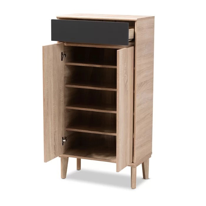 At Asghar Furniture, This 2-Door Entryway 10 pair shoe storage cabinet is an exquisite addition to any entryway. Two doors open to reveal five shelves with storage space for up to 10 pairs of shoes. A pull-out drawer located at the top of the cabinet provides additional storage space.