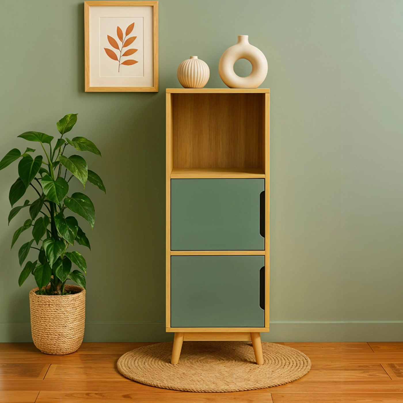 The Nova Tall Storage Tower offers vertical elegance with a minimalist flair. Designed with a warm wood frame, two muted green doors, and an open shelf for display or easy access, this compact unit is ideal for small spaces. Perfect for organizing books, décor, or daily essentials, it brings both style and smart storage to modern interiors.